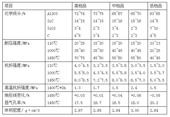 由于我國高爐出鐵溝過去一般用黏土熟料、焦粒、廣西白泥和焦油瀝青搗制而成的耐火澆注料,通鐵量少,修補頻繁,勞動強度大,污染環(huán)境;后來,采用Al2O3 ~ SiC ~ C 質(zhì)搗打料,通鐵量顯著提高,但勞動強度大;到80年代后期,開發(fā)了Al2O3 ~ SiC ~ C質(zhì)超低水泥耐火澆注料。該類澆注料一般用致密白剛玉、亞白剛玉、棕剛玉、優(yōu)質(zhì)高鋁熟料、碳化硅和鱗片石墨等材料,再摻加超微粉、結(jié)合劑和外加劑配制而成。其性能,見下表。表中,高中檔產(chǎn)品適用于大、中型高爐出鐵溝,中低檔產(chǎn)品則適用于中、小型高爐出鐵溝或渣溝。